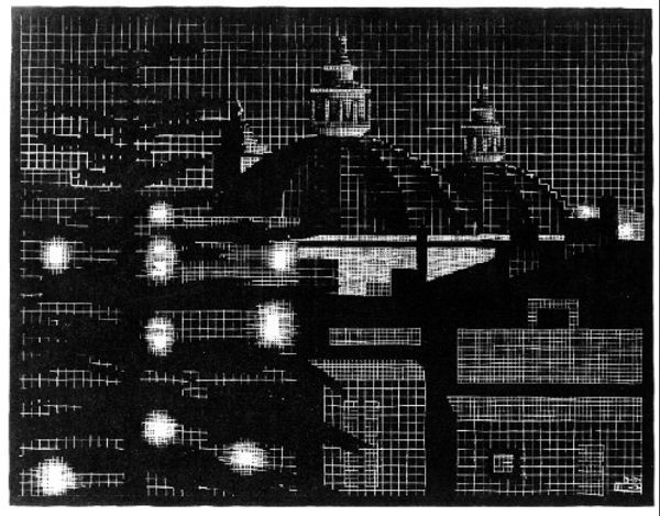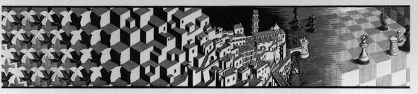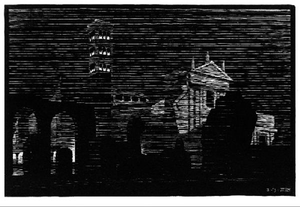 This print, "Church Domes," was made by M.C. Escher, using wood engraving. This painstaking, meticulous technique involves carving an image into the end grain of a block of wood, then inking the surface to create a relief print. The image consists of a grid that overlays an architectural scene. Each tiny square must be individually cut away to create the image. This allows for incredibly fine detail and tonal variation. The domes themselves, rendered with remarkable precision, show Escher's mastery of perspective and his ability to create depth and dimension on a flat surface. The method of production, requiring hours of labor, speaks to a pre-industrial sensibility, even though the subject is architectural, and therefore tied to the expansion of cities, consumption, and building. Consider the tension between the graphic and the sculptural, the mechanical and the handmade, and the traditional and the modern, all of which co-exist in this compelling print.