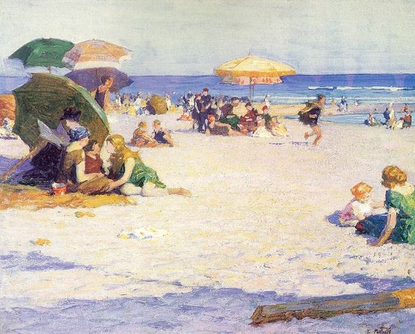 Editor: This is "In Dog Days," an oil on canvas painting by Edward Henry Potthast. It captures a busy beach scene. What really strikes me is the visible brushwork, especially in the depiction of the water and sand; you can almost feel the textures. What do you see in this piece? Curator: The roughness of the paint application interests me. The visible labor and the apparent speed with which Potthast captured this scene point to a democratizing shift in art production. It moves away from polished, academic portrayals towards a celebration of the everyday, accessible through inexpensive, readily available materials. Think about how the masses now have access to affordable paints and the democratization of leisure, shaping both the subject and the means of producing this kind of art. Editor: So you are saying the very materiality of the paint and the “roughness” connect to the social changes? It wasn’t just about representing a scene, but the act of painting itself was evolving with society? Curator: Exactly. Consider the plein-air technique. Artists venturing outside with their canvases and paint boxes wasn't just about depicting landscapes accurately; it reflected a changing relationship with work, leisure, and even consumption. Mass tourism was on the rise, creating new markets for such artworks, didn’t it? Editor: I never really considered that the physical materials could tell us so much about the culture and even the economy. Thanks, that’s really shifted how I look at it! Curator: Absolutely. Looking at art through its material production reveals much more than artistic intention alone. The piece now evokes a wider understanding of 19th-century social change!