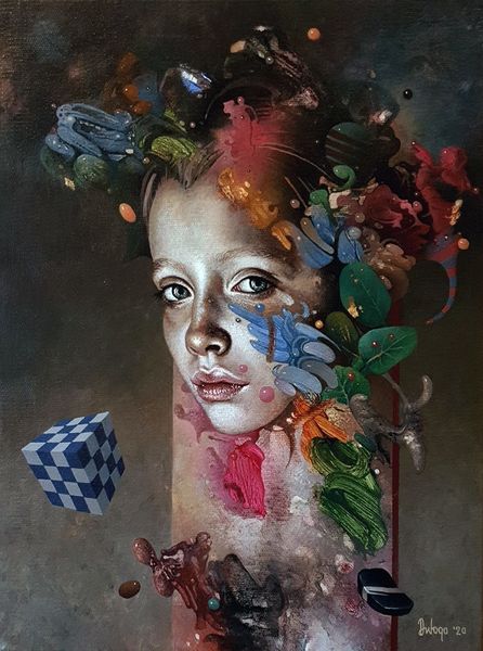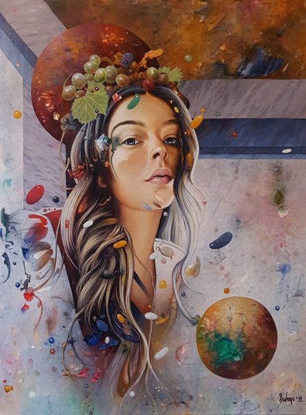 Editor: Here we have Dragan Ilić Di Vogo's 2022 oil painting, "Tamara." The blending of realistic portraiture with surreal cityscapes gives it a dreamlike, almost floating quality. What visual stories do you find unfolding within this image? Curator: It’s a fascinating layering of realities, isn't it? Notice how the portrait of Tamara seems to almost bloom out of this cityscape, like a memory or an idea taking form. The cityscape itself— with its identifiable, contemporary architecture — grounds the portrait in a specific time, yet the presence of the planetoid introduces a sense of timelessness, an expansive "once upon a time," if you will. Does the juxtaposition resonate with you? Editor: Definitely, the blend is intriguing, the modern cityscape paired with that distant planet really stretches the idea of where and when this is happening. The flowing, almost liquid quality that connects Tamara to the city—how does that contribute? Curator: Precisely. That visual linking speaks to me of a deeper connection, a psychological landscape where the self is intrinsically intertwined with the built environment, or even more universally: connected to the cosmos. Those tendrils almost suggest neural pathways, perhaps indicating the city exists within Tamara’s mind, or she within its collective consciousness. What emotional undercurrent does this merging create for you? Editor: I think it hints at the powerful influence environment has in shaping identity; also that our inner worlds contain entire universes of memory and imagination. So, identity becomes this fluid, shifting interplay of external and internal. Curator: A wonderful reading! It exemplifies the painting's potent use of visual symbols and the continuing dialogue between person and place. It seems the artist encourages us to acknowledge the powerful reciprocal relationship that shape our sense of being. What a truly thoughtful, contemporary iconography, don’t you think? Editor: Absolutely, it highlights how symbols aren't fixed but evolve with our understanding and experiences. Thank you!