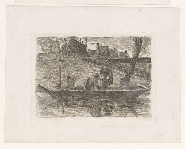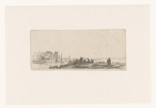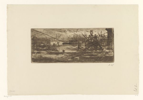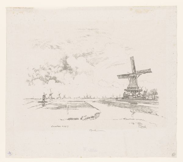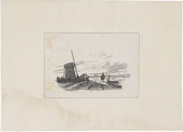 Editor: Here we have "Landscape with Skaters on the Ice around a Mill," an etching by Jacques Van Gingelen, dating back to 1842. It has this quiet, almost dreamlike quality about it. What do you see in this piece, looking beyond its calm exterior? Curator: I see a commentary on community and the human relationship with the environment, but also potential anxieties about industrial encroachment. While ostensibly a picturesque scene of leisure, think about what a frozen landscape represents – a temporary suspension of natural order, a moment of shared risk and opportunity. The windmill, then, looms not just as a feature of the landscape, but as a symbol of changing economies, perhaps even threatening the very community it serves. How does the artist position the human figures in relation to the dominating architecture of the windmill? Are they dwarfed or empowered? Editor: That's a compelling take. I initially saw it as just a simple genre scene, but your perspective makes me think about the power dynamics. The people do seem smaller, more vulnerable. Is this commentary about industrialization unique to this artist or time period? Curator: The anxieties were brewing across Europe, as agriculture and trade evolved. Artists like Van Gingelen found themselves at a crossroads, reflecting both the charm of the familiar and the unease of the future. It's worth thinking about whose perspective we see in these idyllic scenes. Does it romanticize rural life or critique the changes happening? And whose voices are missing from this picture? Editor: I never would have considered that without your input! I learned to really dig deeper and contextualize my understanding. Curator: Exactly, it’s about seeing the threads that connect art to larger social and political conversations.