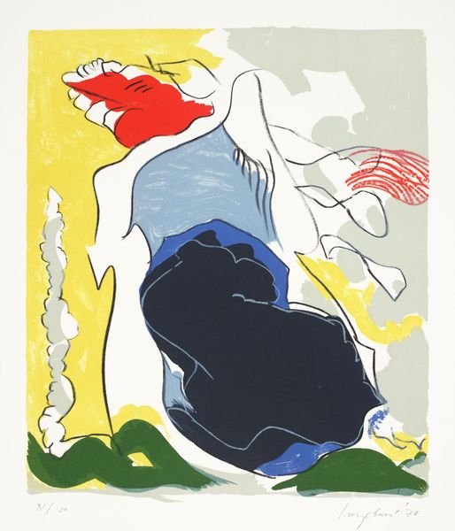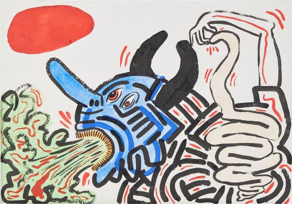 Curator: Laylah Ali's "Untitled (Superman)" presents us with a figure in flight, seemingly suspended against a pale blue backdrop. What strikes you first about this work? Editor: The color palette is unexpectedly muted, given the subject matter. That red cape really pops, but the rest feels…off-kilter. Curator: It's fascinating how Ali uses this flattened perspective and somewhat awkward figuration to perhaps subvert the typical superhero narrative. The figure seems vulnerable, doesn't it? Editor: Absolutely. The crude drawing style and the figure's almost cartoonish features contrast sharply with the idealized form we associate with Superman, complicating notions of power and heroism. Curator: Exactly, and in the context of Ali’s broader work, we might read this as a commentary on the constructed nature of identity and the roles we play. Editor: It's a far cry from soaring, majestic superheroes. The piece lingers in the space between aspiration and reality. Curator: Indeed, it challenges our expectations of the superhero archetype, prompting us to consider the social and political implications inherent in these images. Editor: A visually simple piece that holds complex layers, then.