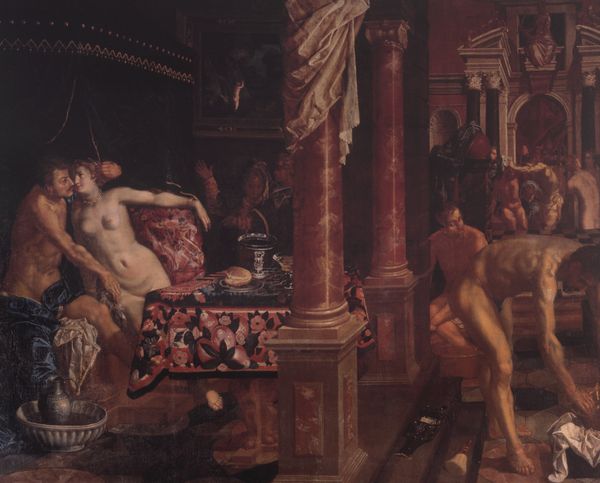 Curator: John Collier's "The Death of Cleopatra," painted in 1890, is an imposing history painting rendered in oil. It captures a pivotal moment in ancient history. Editor: It’s so theatrical, isn’t it? The intense chiaroscuro and heavy drapes create a very dramatic space. And the gold fabric spilling down… visually striking. Curator: Indeed. The gold alludes not only to Cleopatra's power and status, but also the allure of worldly treasures that led to the downfall of civilizations across the Ancient World. Notice also the almost vacant expressions on the attendants faces. Collier masterfully depicts a psychological withdrawal in the face of such dramatic, paradigm-shifting, events. Editor: Right, the facial expressions… almost formulaic. The central horizontal of Cleopatra’s body creates a stark contrast with the very strong verticals of the Egyptian sculptures and architecture, forming a powerful composition that's undeniably striking and… perhaps intentionally rigid. Curator: I find the cultural resonance of Collier’s approach deeply affecting. Cleopatra represents much more than an individual, but instead the intersection of Greco-Roman power struggles in conversation with Egyptian iconography and spirituality. The very inclusion of ancient sculpture in this historic narrative is representative of the ever-present symbolic force exerted from the ancient world onto modern life. Editor: And yet, there’s something about the execution that feels…stilted. The realism feels strangely contrived, somehow undercutting the inherent drama of the subject matter. Curator: But isn’t that almost appropriate for this exact moment of transition? Death is precisely the kind of frontier or border state when what you believe confronts a sharp reckoning with corporeal fact, like two irreconcilable forces. Editor: An interesting perspective. Well, whatever its interpretive shortcomings, it undoubtedly captures the imagination with its lavish details. Curator: It is truly interesting how this artwork can still challenge us, generations later. Editor: Absolutely, an artwork layered with so much technique will likely spark conversation for many more years to come.