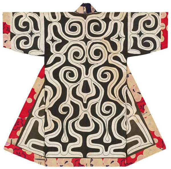 Kaparamip are robes made of cotton decorated with a large number of white appliqués in cutout patterns. In the early 17th century, merchants brought cotton cloth to the Ainu, who employed it as a thinner, lighter alternative to traditional materials. Cotton offered Ainu women new aesthetic opportunities, yielding patterns that were more fluid and organic than those found on other types of robes. In both kaparamip shown here, the pieces of white cotton are stitched together to form one large appliqué that covers the entire garment. The sleeve openings and the edges are embellished with pieces of red-dyed cotton, intended to ward off spirits.