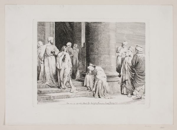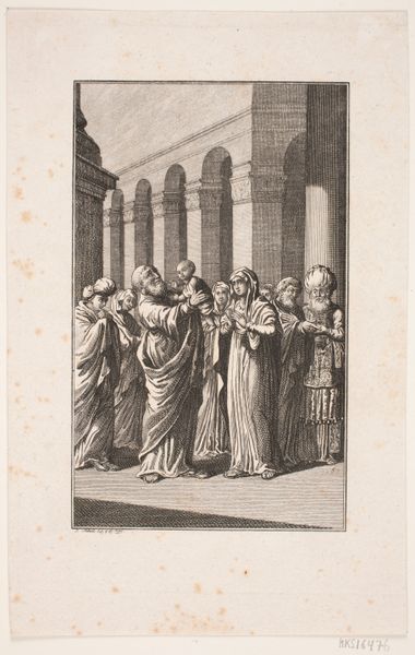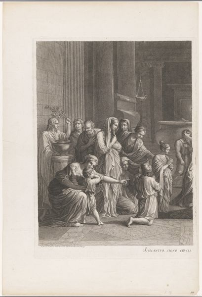 Editor: We are looking at "Vormsel (rechter deel)," an engraving by Jean Pesne, likely created between 1633 and 1700. It depicts a religious scene and I am struck by how formal and weighty the ceremony seems to be. What can you tell us about the symbolism embedded in this print? Curator: This image presents us with a fascinating interplay of symbolic weight and cultural memory. The laying on of hands, the chrism, the priestly vestments—these are not merely visual elements, but potent symbols invested with centuries of religious significance. The architectural setting, vaguely Roman, contributes to a sense of historical continuity. Do you recognize how the artist uses light to guide the viewer's eye and emphasize certain figures within this image? Editor: Yes, I notice how the central figures, particularly the man receiving the blessing and the priest, are illuminated. The light seems to emanate from them, which I am guessing is intentional. Curator: Precisely. Light, here, acts as a symbol of divine grace, drawing the viewer's attention to the spiritual transaction occurring. How do you feel the figures react in that particular context, particularly the two altar boys and the figures in the background? Their positioning and gaze emphasize their role in witnessing and participating in this spiritual rite of passage, imbuing this Baroque print with a powerful connection to the viewer's shared humanity and experience. Does that add another dimension for you? Editor: Absolutely! It brings this somewhat distant historical scene into sharper focus, making it feel more personal and relatable. Curator: It shows how even in what seems like a distant historical scene, visual symbols connect us to shared human experiences and enduring cultural values. Editor: I had not noticed that until you called it out. Thank you, this has helped me understand how cultural meaning can be conveyed through art.