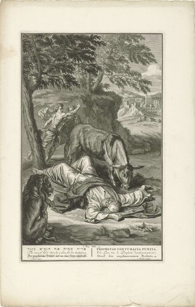 Bernard Picart created this print, "Telemachus doodt een leeuw", in the early 18th century. Look at the composition; the foreground bursts with action, while the background recedes into a landscape filled with fleeing figures and slender trees. The dark and light lines carve out the central drama: Telemachus in mortal combat with a lion. See how Picart uses line to render the bodies in tense, coiled forms. Note the almost classical arrangement of figures and the way the tree on the left acts as a structural anchor, its trunk mirroring Telemachus's struggle. Picart's Telemachus is not merely a scene but an essay on the nature of heroism, visualized through the formal opposition of man and beast, order and chaos. It is a dynamic study in contrasts.
