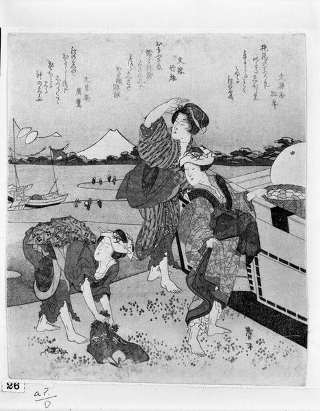 Editor: This woodblock print, "Parody of the Yūgao Chapter of the Tale of Genji" by Suzuki Harunobu, is striking. I'm curious about the materials and how they were used to create such detail. How should we interpret this work through a materialist lens? Curator: Notice how the woodblock printing process, a form of mass production, democratized art consumption. Consider, too, the labor involved. What social dynamics are reflected in the choices of subject matter, and how does it engage with high art traditions? Editor: It's fascinating to think about art consumption at the time, and also how that relates to the labor of creating it. Curator: Precisely. By analyzing the materials and the means of production, we uncover the work's engagement within the broader social fabric of its time.