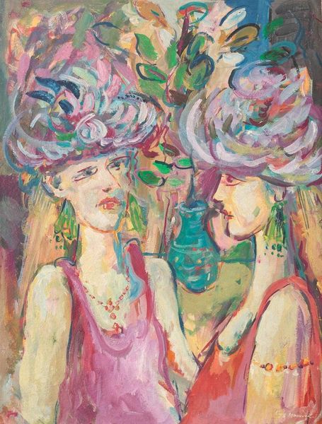 Editor: This untitled oil painting by Vladimir Dimitrov presents three figures in what looks like traditional clothing. There's a certain solemnity, almost a melancholy, that permeates the scene. How do you interpret this work? Curator: It strikes me as a powerful assertion of cultural identity. The figures' traditional attire, coupled with their somber expressions, suggests a deep connection to their heritage. Considering Dimitrov’s background, it invites us to explore questions of nationalism, tradition, and the representation of women within specific cultural contexts. What stories do you think their garments are telling? Editor: I hadn't thought about the garments as narratives themselves! The repeating patterns and muted color palette now seem more deliberate, almost like a coded language about their status or community. Curator: Exactly! The visual language points to shared histories and perhaps even struggles. Expressionism isn’t merely about conveying emotion, but also about using art as a tool for social commentary. Could this be a statement on the role of women in preserving cultural memory? What do their collective gazes suggest to you? Editor: Now that you mention it, their averted gazes and almost identical expressions suggest a shared experience, maybe a burden or a secret that binds them together. It feels less like individual portraits and more like a representation of collective identity. Curator: Precisely. By exploring themes of cultural identity and collective memory through the lens of gender and tradition, Dimitrov's "Untitled" pushes us to consider the intersections of personal experience and broader social narratives. Editor: I'll definitely view portraiture with different eyes from now on! Curator: Excellent! Hopefully, understanding artwork such as this encourages us to look at art as a mirror reflecting our history and society.