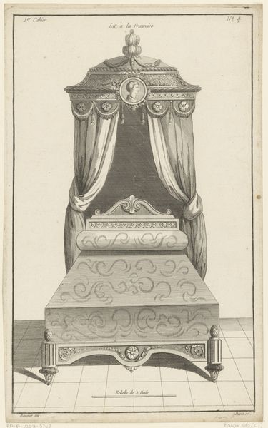 Curator: Richard de Lalonde's "Oeuvres Diverses de Lalonde. Tome 2." dating from the late 18th century, presents an intriguing look into the design sensibilities of the Baroque era through the medium of engraving. Editor: My first impression is one of opulent confinement. The bed seems luxurious, almost suffocatingly so, with all those heavy drapes. Curator: Indeed. Let’s consider the formal elements at play. The intricate line work, indicative of engraving, defines the shape of the "lit à la duchesse," and draws the eye towards the carefully rendered sculptural details that adorn the bed. Note the strategic deployment of hatching to evoke tonal values and spatial depth, highlighting the emphasis on form itself. Editor: But is it *just* about form? It seems more a proclamation of aristocratic excess right before the Revolution. A "lit à la duchesse," designed in a moment when questions of the monarchy and power were at the forefront. Can we ignore how a piece like this speaks to broader issues of inequality and social unrest brewing at the time? It is hardly a neutral composition, given what it represents. Curator: While that perspective is valid, viewing the work through a purely sociopolitical lens may obscure the intended focus. De Lalonde’s interest seems to be in exploring the potential of decorative art and design within the Baroque aesthetic framework. See how the engravings meticulously catalogue these lavish designs. Editor: But surely that very act of meticulous cataloging has meaning. It's not simply a passive recording but an active participation in shaping a culture of consumption, catering directly to elite desires, ignoring those excluded. What can we interpret from that intentionality? Curator: Ultimately, De Lalonde’s engraving compels us to analyze form, function, and historical context. Editor: Exactly. We must engage not only with its artistic attributes, but how those attributes engaged with a much larger socioeconomic landscape.