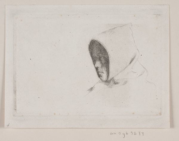 Curator: Hello, and welcome. Here we have Carl Bloch's "Den leende Munk", or "The Smiling Monk," from 1884. It is currently held at the SMK, the National Gallery of Denmark. It's an etching, which gives it a delicate, intimate feel. Editor: My goodness, what a charmer! It's small, isn't it? And he looks like he knows a secret, a really good one. I can't help smiling back. He has such a kind face, not at all what you'd expect, stereotypically at least, from depictions of monks. Curator: Bloch often engaged with religious subject matter but this one does depart from more devotional works. Prints such as this one gained popularity as ways for middle-class individuals to possess images they found intriguing or touching; allowing people to build a sense of community by circulating artwork with a human element. Editor: It is incredibly approachable. The technique too. I’m really drawn in to that quick, almost sketch-like quality. You can feel his hand moving across the plate, figuring out just the right angle of that hood. Look at those subtle lines around his eyes, catching the light and animating his smile, and the textures suggesting folds of his habit. It's a portrait, but somehow it also captures a fleeting moment. I love that! Curator: Absolutely. Bloch had extensive training in technique which he adapted for diverse functions; he’s most widely celebrated for paintings in churches, yet clearly delighted in producing prints for domestic display. He also made genre-paintings and historical works, and portraits, showing a true interest in contemporary tastes and opportunities. The placement on the paper itself is worth noting: such a relatively small figure against such a stark, generous backdrop is quite arresting. Editor: The print's minimalism certainly adds to that sense of peacefulness, or contained glee! Makes me think of someone trying not to laugh out loud during a sermon, that mischievous feeling we all get sometimes! You almost feel conspiratorial in beholding that very individual emotion. Curator: He’s relatable despite his monastic life, I would say, appealing across centuries and beliefs to anyone able to enjoy simple pleasures. Thank you for joining me to explore his legacy in art. Editor: Indeed. It’s the sort of artwork you could imagine living with and coming back to time and again to cheer yourself up! It's a great choice and highlights that it's always worth making time for quiet observation.