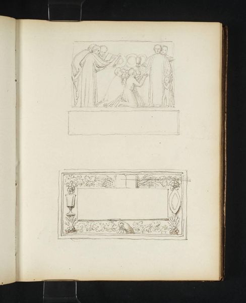 Editor: This is an undated sketch by John Flaxman from the Tate Collections. The dimensions are approximately 198 by 156 millimeters. It has such a spare quality. What do you make of the composition? Curator: Note how Flaxman employs line as a primary means of articulation. Observe how the figures are rendered with minimal shading, emphasizing contour and form. How does this linearity affect your perception of depth and volume? Editor: It flattens it out, almost like a bas-relief. I'm just curious if that's intentional. Curator: Precisely. The reduction to essential lines suggests a deliberate move towards classical simplicity, aligning with Neoclassical ideals prevalent during Flaxman's time. The subdued nature invites contemplation on fundamental forms. Editor: I see. It's definitely made me look closer at the lines themselves. Curator: Indeed, and hopefully appreciate the elegant efficiency with which Flaxman communicates form.