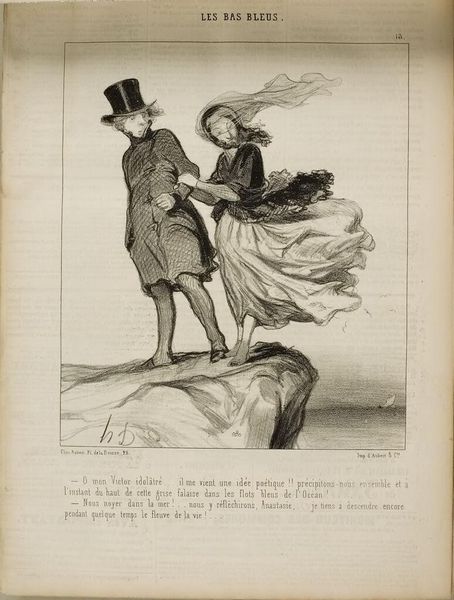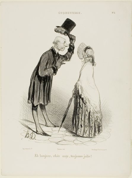 Editor: This lithograph by Honoré Daumier, "And hello... looking lovely, as always!", presents a rather comical scene. What do you make of the exaggerated features and body language? Curator: Ah, Daumier! He saw the humor, and often the darkness, in everyday life. Notice how the man's elongated nose and eager posture contrast with the woman's demure stance. It's a snapshot of social dynamics, wouldn't you agree? Editor: I suppose so. It feels like Daumier is poking fun at the superficiality of courtship. Curator: Precisely! His lines dance between caricature and keen observation, inviting us to smile, perhaps a bit ruefully, at ourselves. It's a timeless commentary, really. Editor: That's a new perspective. I was so focused on the humor, I missed the critique. Thanks!
