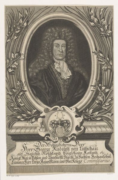 Curator: Looking at this engraving of Nicolaus Ernst von Natzmer, likely created between 1685 and 1737 by Johann Wilhelm Michaelis, what strikes you? Editor: The wig! I mean, that cascade of hair—it feels almost overwhelming. And then there’s the juxtaposition of that flowing wig against the stark lines of the armor. It makes me think about surfaces and contrasts in a very material way. Curator: Exactly. This portrait offers insight into the visual language of power and status of that era, and the means by which they were conveyed. Natzmer's depiction is steeped in Baroque aesthetics, yes, but it speaks to something larger—the performance of masculinity within very specific socio-political structures. How does his status play into how Michaelis chooses to create and represent it? Editor: Absolutely, the armor. The intricate rendering of the armor plate really draws my attention. One can almost imagine Michaelis meticulously carving those lines into the plate. Engravings such as this weren't simply documentation; they were a demonstration of the artist's labor and technical mastery. The reproduction carries inherent prestige, not just for its subject, but also through craft. It also acted as social promotion, showing what was achievable with his chosen materials. Curator: Consider too the semiotic density—each visual element functions as a signifier in service to crafting and conveying identity. His full title sits boldly below him, but the symbolic construction happening is more intricate. This goes far beyond technical representation to ask who held the means of expression and how was the means were deployed. Editor: It certainly adds layers of complexity and depth to what we see, forcing us to think about the act of creation and consumption beyond simple aesthetics or representation. What I find really remarkable is how a seemingly simple portrait becomes a tangible entry point to discussing those questions. Curator: Agreed. A simple rendering, if we chose to see it that way, yet richly resonant, still speaking across centuries.
