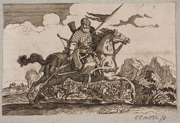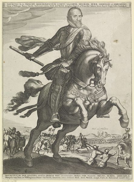 Crispijn van de Passe II created this engraving, *Portrait of Louis XIII on Horseback*, in the 17th century, during Louis’ reign. It’s a compelling example of royal portraiture used to construct and maintain power. Louis is depicted as a strong military leader, riding a rearing horse, his gaze fixed and determined. He is armored and carries a commander's baton, symbols of his authority and martial prowess. In the background, a battle rages, further emphasizing his role as a warrior king. The print includes a laudatory inscription of Louis XIII, comparing him to Hercules. But consider the context: Louis XIII’s reign was marked by political intrigues and religious conflicts. This image, then, isn't just a portrait; it’s a carefully constructed narrative aimed at solidifying the king’s image. It invites us to consider how power is performative, and how images shape not only perception but also the very fabric of historical memory.