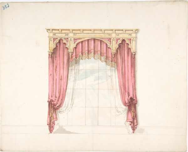 Editor: This is "Design for Red Curtains with Gold Fringes and a Gold, Red and White Pediment," a watercolor and print work from between 1800 and 1850, housed here at the Met. I'm struck by the theatricality of the design – it feels like a stage curtain. What stands out to you? Curator: The historical context surrounding the production and reception of this design is fascinating. Consider the rise of consumer culture during the 19th century. Designs like these, circulated as prints, fueled desires and shaped aspirations for domestic spaces. This watercolour isn't simply about aesthetics, but also the politics of taste and the democratization of design. Do you think that having more people who are exposed to visual imagery affected how tastes shifted over time? Editor: Absolutely, exposure plays a big role. The industrial revolution was occurring, so as more affordable options were becoming accessible, consumer preferences most likely followed. Why this specific style for the drapes? Curator: These heavy, ornate drapes signified status and wealth. Think about the role of domestic space in projecting social standing during this era. This design reflects the values of a burgeoning middle class eager to emulate aristocratic styles, indicating a societal shift, from the aristocracy to new socio-economic groups. To what extent do you see this kind of design as a form of social climbing through visual display? Editor: It’s an interesting question. Visual displays definitely reflect values, especially ones in domestic environments. I can see how the imagery in an interior acts like another form of showing success. Curator: Precisely! So this piece becomes more than just a pretty picture; it becomes a cultural artifact. Thank you for helping me gain clarity on the dynamics behind the designs, which gives great context for others. Editor: Of course, I think I’ll view visual and material culture with more historic depth, after this insightful conversation!