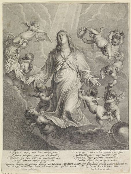 Cornelis Schut made this etching, The Coronation of Mary, sometime in the first half of the 17th century. As an etching, the image is made by drawing into a waxy ground on a metal plate, which is then bathed in acid. The incised lines hold ink, and are transferred to paper under pressure, documenting Schut’s draftsmanship. The real subject here is line itself, which creates all the tone and texture. It is important to remember that an etching is a multiple; many impressions can be taken from the plate, and sold widely. The beauty of the etching lies in its reproducibility. The image depicts the Virgin Mary, surrounded by cherubic figures, ascending to heaven. It suggests how the graphic arts, like etching, allowed the Church to disseminate its message widely. Consider the labor that went into this image, the skilled work of both artist and printer, and how this painstaking, repetitive work served a larger ideological purpose.