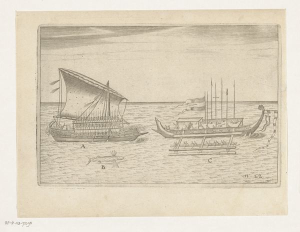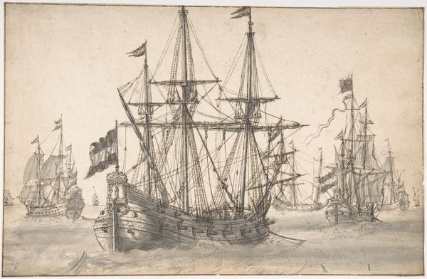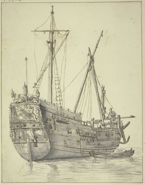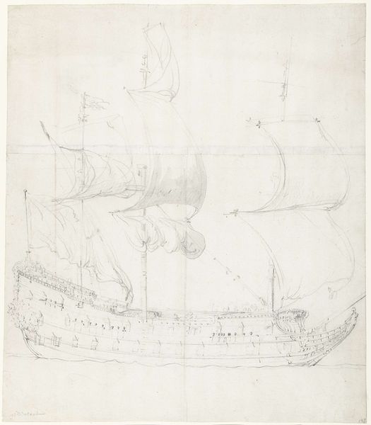 Editor: Here we have Willem van de Velde the Elder’s pencil drawing, "Schip de Princesse Royale van vice-admiraal Witte de With", likely made sometime between 1621 and 1707. I’m really struck by the almost fragile quality of the lines, yet it captures the grandeur of the ship so well. What jumps out at you when you look at this drawing? Curator: Well, considering this work, one immediately thinks of the socio-political implications of naval power during the Dutch Golden Age. This wasn't just a ship; it was a floating symbol of Dutch mercantile prowess and military might. A vessel carrying not just goods, but national ambition. It also underscores how art was used to propagate this image. Editor: So the ship itself is a symbol, and the drawing further amplifies that symbol for public consumption? Curator: Exactly! Van de Velde wasn’t simply documenting a vessel; he was actively participating in shaping its image. Think of the role of the Rijksmuseum now. Where do such drawings fit within their collection mandate? Do they reinforce certain nationalist narratives even today, albeit subtly? How does showcasing a drawing versus an oil painting influence viewer perceptions of national identity and history? Editor: That's a great point! I never considered the museum's role in continuing these historical dialogues. Perhaps its placement in the museum frames our understanding of Dutch power in the 17th century. It is presented in a new and important social context. Curator: Indeed. And the subtle shift from recording reality to shaping perception is at play. Understanding art means acknowledging this continuous power interplay. What does this type of art mean in a contemporary and increasingly globalised context? Editor: Thinking about it that way has really expanded my appreciation for the historical layers embedded within seemingly simple drawings. I'll definitely consider that moving forward.