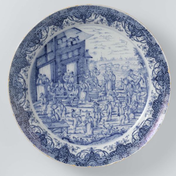 Curator: Before us is a plate created by James Clews, likely sometime between 1827 and 1836. It's currently held here at The Art Institute of Chicago. Editor: It's so evocative! A classic blue and white, transfer-printed scene…a little romantic, a little nostalgic, very domestic. The cobalt gives it a crisp feel, despite the subject's quaintness. Curator: Precisely. The color and imagery, so closely associated with Staffordshire pottery of the time, became hugely popular in America as well. The central image displays an American town scene complete with church and common green. These landscapes represented stability and order. Editor: It makes me consider the labour. Who created this design? How were these printed images then transferred to plates? What role did child labour have in its mass manufacture, and who actually used this on their tables? We have the final product here, neatly displayed, but a whole industrial process hides behind it. Curator: Absolutely, but even within that process, certain decisions were made for their visual or symbolic resonance. Look at how that single tree is prominently placed in the center foreground – almost a visual bridge between the earthly realm of the village and the aspiration toward heaven symbolized by the church spire. And what is the symbolism in this image being mass produced? Editor: You are right, while maybe initially symbolic and romantic for the middle class, its replication ultimately led to the image becoming simply a feature on a dining set as these landscapes became further removed from lived reality. Curator: Yes. Consider this "Plate" then, a portal not only to another time but also to a dialogue about art, society, and the echoes that imagery carries through time. Editor: Well put. It just shows, even the simplest mass produced item contains multitudes once we start considering all the angles of production and meaning making.