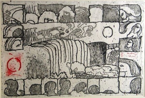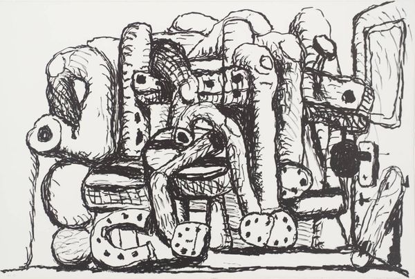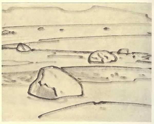 Curator: Philip Guston's "Easel" presents us with a charcoal drawing, possessing dimensions of approximately 510 by 765 millimeters, currently held in the Tate Collections. Editor: It feels stark. The limited tonal range creates a rather somber, almost apocalyptic mood, doesn't it? Curator: Indeed. Observe how the central motif of the work seems to be a log, and sprouting from it, ambiguous forms—perhaps crude representations of flora. Doesn't the positioning evoke a sense of growth from decay? Editor: The crude forms suggest an unconscious grappling with the symbols of art and nature. The easel itself, only implied, makes me think about the artist's struggle with representation. Curator: The rough texture adds to that sense of struggle and directness. It's art stripped bare, confronting its own foundations. Editor: Yes, a return to basics. I see in it a meditation on mortality and the enduring power of symbolic forms, even in their most rudimentary state. Curator: A powerful reminder that even from the most fundamental elements, complex meanings can arise. Editor: Precisely. And with that, we glimpse into the soul of the artist.