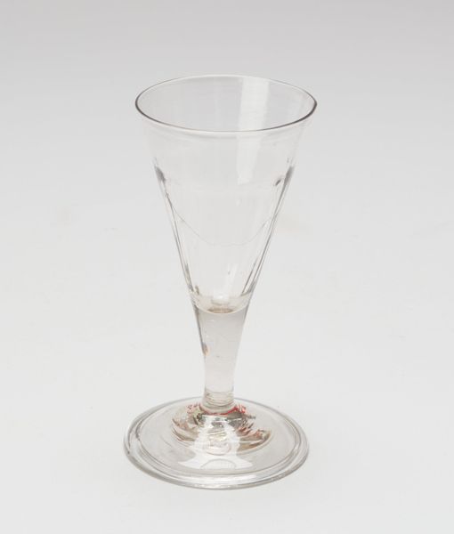 Editor: Here we have a Wine Glass, dating back to around 1765, crafted from glass in England. Its slender shape and transparency create a delicate aesthetic. I'm immediately struck by its simple elegance. What do you see in this piece, looking beyond its functionality? Curator: Indeed, beyond its utility, we find a fascinating study in form. Consider the geometry at play: the conical bowl contrasts with the spherical knop in the stem, leading to the circular foot. This interplay of shapes creates a visual rhythm, doesn't it? Note how the transparency of the glass allows light to define its contours. It is pure structure. Editor: I hadn't focused on that geometric dance, that is brilliant! Does the transparency itself have any significance? It almost feels like it disappears. Curator: Precisely. Transparency negates the object’s mass, reducing it to pure form and light. This creates an ethereal quality. The way the light filters and refracts becomes paramount, almost as important as the object itself. Editor: That makes me consider the negative space as being just as important. How the light plays within the void of the glass shape. I never considered drinking glasses as being philosophical objects. Curator: The intention isn’t merely to hold wine. The artist manipulated formal elements: shape, line, light, and transparency, creating, in essence, a study of presence and absence, mass and void. These are visual strategies we also find mirrored across art history. What does thinking about those visual components bring up for you? Editor: Now I see how a seemingly functional item becomes an interesting arrangement of geometrical shapes with carefully studied forms, not really different from sculpture! Thanks for your thoughts. Curator: My pleasure, recognizing these forms can lead us to understand other shapes as forms, so, this work ultimately points to new potential relationships.