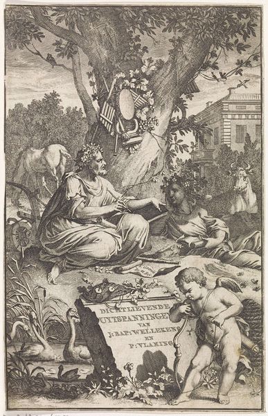 Curator: This etching by François Chauveau, "Meleager and Atalanta," made between 1638 and 1648, is a fascinating example of Baroque printmaking. The swirling lines and dramatic scene have a definite energy. What strikes you about this piece? Editor: Well, the circular composition is interesting, and the detail achieved through etching is impressive, but what’s more engaging to me is the combination of classical figures with these playful cherubic forms, a very clever connection! I'm curious about the process of creating it. How was this sort of intricate detail achieved back then, and how did it fit into the broader art market? Curator: Excellent questions! We should focus on the labor involved. Etching demanded significant skill and time, requiring the artist to meticulously transfer the design onto a metal plate covered in wax, then use acid to bite away at the exposed areas. This was painstaking work. These prints became accessible commodities, think of the labour reproduced and consumed within this scene. Consider too the social implications: were these images aimed at specific patrons? Did Chauveau operate within a guild system? Editor: That’s interesting. The idea of accessible art brings a question: what about the choice of materials? Would cheaper materials influence accessibility? Curator: Exactly! Paper quality, ink types— these affected price points and, thus, the accessibility. We should investigate the social status of printmakers relative to painters or sculptors at the time to reveal insights into artistic labor’s value in 17th-century France. The relationship between production, material, and value, helps uncover so much about artistic economies of the Baroque era. Editor: Thinking about it this way shifts my perspective completely. Instead of just admiring the image, I'm thinking about the artisan's hands, the supply chain of materials, and the consumer for whom it was intended. It makes the artwork far more complex. Curator: Precisely! Now we have an angle of production to consume this scene with, adding value far beyond its initial glance!