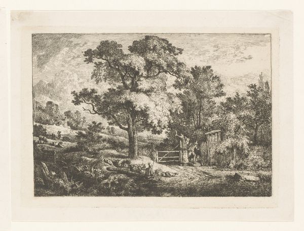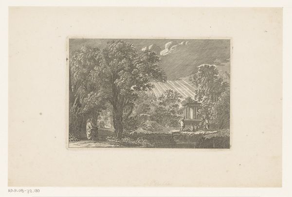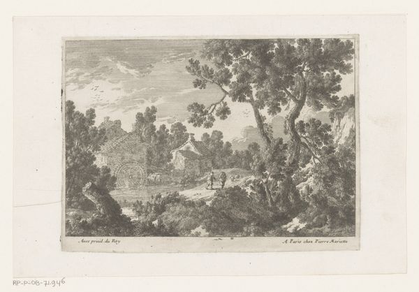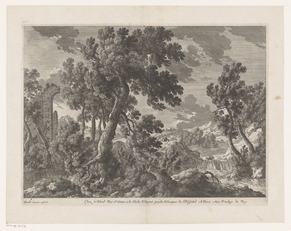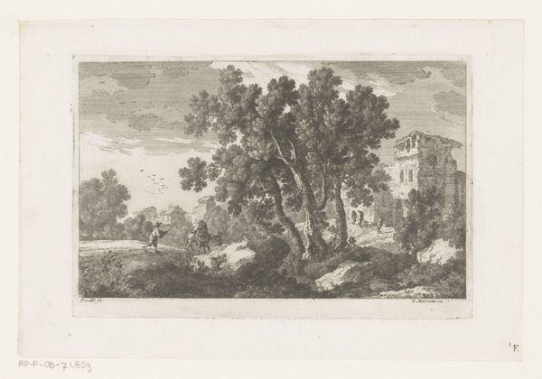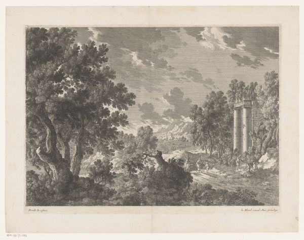 Nicolas Perelle made this print depicting the myth of Narcissus, but it’s less about the story, and more about the making. Consider the etching process itself: a metal plate coated with wax, lines scratched through it, then acid is applied, biting into the exposed metal. Ink fills these grooves, and pressure transfers the image to paper. The result is a reversed image, rendered in delicate lines. Now, think about what Perelle chose to depict: an idealized landscape, classical ruins, and of course, Narcissus gazing at his reflection. This wasn't just about aesthetics; it was about social status. Owning prints like these signaled taste and refinement, aligning oneself with the cultural elite. But let's not forget the labor involved. The engraver, likely working in a bustling workshop, meticulously transferred Perelle’s design onto the plate. This print, then, is a testament to both artistic vision and skilled craftsmanship, blurring the lines between art and industry.