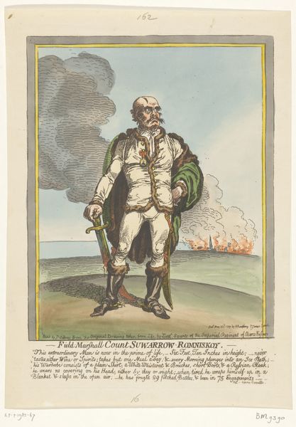 Curator: My first impression is just utter chaos, a whirlwind made visible! There's a wildness and humor in it, almost like a Looney Tunes episode unfolding. Editor: I love that observation! Let's contextualize. We're looking at "A Tailor in a High Wind," an etching created around 1819 by George Cruikshank. Currently it is at the Art Institute of Chicago. It is a fascinating example of social satire, a genre very much en vogue at the time. Curator: Ah, satire makes sense. Is the figure meant to represent someone specific? Editor: While not a direct portrait, many believe it mocks the nouveau riche, individuals aspiring to a higher social standing, hence the alternate title on the work which reads “L'embarras des richesses”. The tailor, caught in this blustery seaside scene, becomes a figure of ridicule. Notice the wild composition. Cruikshank employs a line-etching style to portray an exaggerated scene filled with symbolism. The man is struggling against both literal and metaphorical forces of nature. Curator: The details are so sharp and funny, everything about him seems precarious. Even his wig looks like it's about to fly off! And there are various objects in the air like hats, a wig and even his cloth! Is that little dog in the corner cowering? Editor: Exactly! Animals often symbolize base instincts or a deeper truth in art, and the cowering dog here certainly emphasizes the tailor’s foolish plight. What does all this frenzy bring to your mind? Curator: Well, this resonates with themes of ambition, delusion, and the perils of social climbing. It feels universal because it captures that very human tendency to grasp at things that are perhaps just out of reach, which in return often leaves us looking, well, ridiculous. It’s a stark reminder of our vulnerability in the face of both societal expectations and the unpredictable forces of life. Editor: I concur. In this blustery portrait, we are given both a glimpse of social history, and an insightful understanding of how persistent human drives are satirised for entertainment.