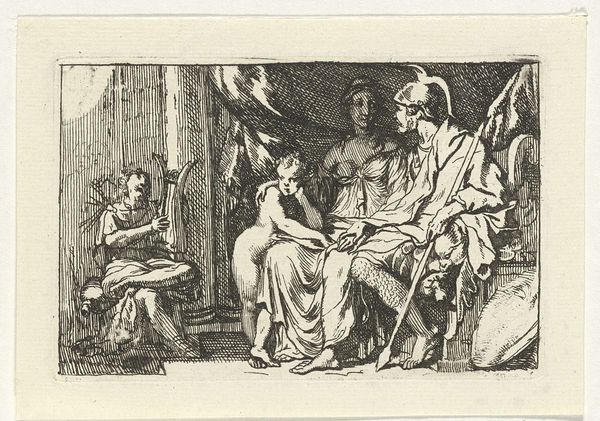 Curator: This delicate print, only a few inches in size, depicts a scene from "The Story of Dido and Aeneas" by Gérard de Lairesse. Look closely, and you'll notice its intricate details. Editor: My first thought? This feels like a stage. The figures are posed, caught in a moment of high drama. The musician on the left gives it an air of melancholy, don't you think? Curator: Absolutely. Lairesse captures the theatricality inherent in Baroque art. The etching technique, with its fine lines, allows for a remarkable level of detail for such a small format. Editor: And that detail really amplifies the tension between Dido and Aeneas, doesn't it? You can feel the weight of fate hanging over them. It’s like a whispered secret on display. Curator: It speaks to the enduring power of classical narratives to explore universal themes of love, duty, and sacrifice. Editor: Yes, a small window into a grand, timeless story. A little intense for its size.