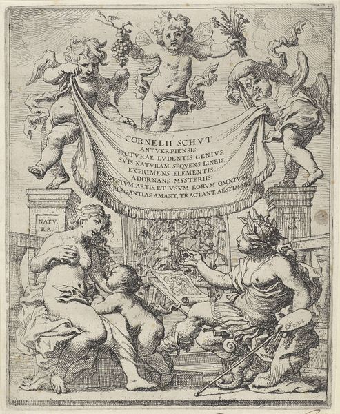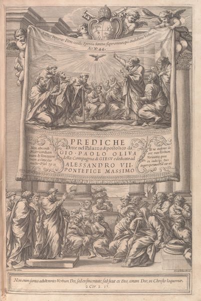 This engraving, "An Emperor and Justice on a Triumphal Chariot," was created by Reinier van Persijn, sometime between 1614 and 1668. The crisp lines and stark contrast create a dramatic visual hierarchy, guiding the eye through layers of symbolic representation. At the top, we see the emperor enthroned. Flanking him are figures bestowing and removing his crown, perhaps allegories of power gained and lost. Below, the title is emblazoned, acting as a structural keystone. Further down, Justice rides a chariot, pulled by horses, symbolizing reason and order. The foreground and background merge, linking the concepts of governance, judgement, and authority within a singular, symbolic space. The composition suggests a world viewed through a lens of classical virtue, where leadership and justice are intertwined. The artwork prompts us to consider how these values are visually constructed and communicated. Is it a celebration of order or a subtle critique of power? The stark, linear form invites an ongoing interrogation of its deeper meanings.