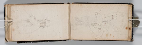 Curator: This is a sketchbook page by Sanford Robinson Gifford, titled "Seated Man with Hat; Male Head; verso: Head Studies; Ear; Sailboat." Editor: Intimate, certainly, and hurried—almost like a visual diary entry. It’s the kind of rawness I appreciate. Curator: Indeed. Think about the materiality. This isn't a finished painting; it is a glimpse into Gifford’s artistic process, his immediate engagement with subjects and scenes, perhaps during his travels, and how the means of production affect the final art. Editor: Absolutely. But these sketches are more than just process; they reveal the casual racism embedded within 19th century art practices, especially in relation to travel and the recording of marginalized peoples. We must consider the colonial gaze at play, even within the seeming innocence of a sketchbook. Curator: That's a powerful point. Thinking about the paper and the graphite marks left behind helps us to contextualize these works and consider their value. Editor: It invites us to re-think authorship, labor, and representation within art history. Curator: Precisely. A small glimpse, but it makes one think. Editor: Definitely.