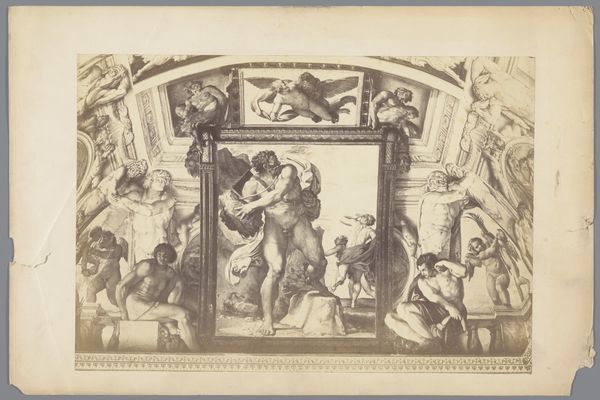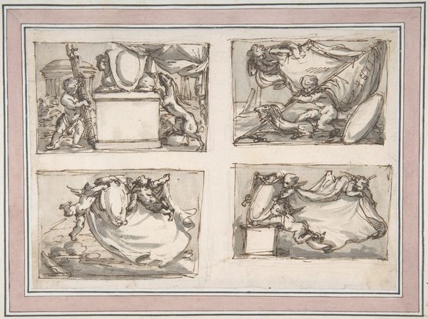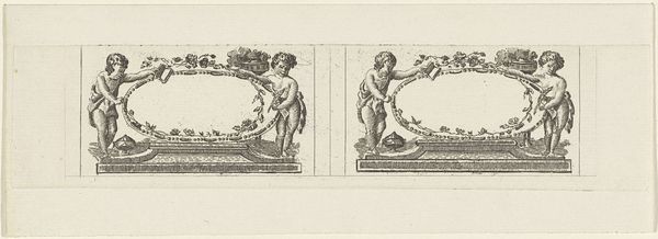 Curator: This is “Man onderwerpt een harpij” created in 1663 by Giuseppe Maria Mitelli. It's an ink engraving on paper. The print depicts two separate figural groups. What strikes you first about it? Editor: The dynamism of the composition. The twisting forms of the figures, combined with the sharp, angular lines of the engraving, create a sense of raw, almost violent energy, particularly in the panel showing the man grappling with the harpy. Curator: Precisely. Let's look at the iconography. The image obviously evokes struggle, with a powerful man dominating a harpy. Harpies, of course, are those winged, predatory creatures from classical mythology, symbols of destruction and insatiable greed. The image presents us with the triumph of reason or virtue over base instinct. Editor: Absolutely. But consider the formal structure of the engraving itself. Mitelli has deliberately placed the figures on these ornate architectural plinths, almost like sculptures come to life. The pillars confine them, framing their actions and focusing our attention on the play of muscles, the strained poses, and the meticulous detail of the line work. Curator: Do you see a connection with Baroque art principles here? I would say that we are encouraged to admire this work as a spectacle. The image is meant to inspire admiration for the strength and virtue of the conquering man, and to instill perhaps a sense of hope, or at least control. Editor: Agreed, Baroque is apt. Also, it’s useful to note the materiality of the artwork itself. The deliberate use of ink and engraving lends a certain harshness to the image. The blacks are dense and the white paper intensely bright, which helps communicate the moral dichotomy on display here. Curator: A perfect observation about how technique and theme align. Looking closely, one can notice that the plinths aren’t just decoration but integral components of the work, lifting up this theme and literally giving it importance. Editor: This brings into perspective how forms are carefully constructed not only to look impressive but to impart meaning about man’s mastery. Curator: Indeed. From a cultural studies angle, “Man onderwerpt een harpij” also presents an ideological proposition that resonates with our current era: an embrace of discipline, resilience, and resolve, to combat those vices threatening personal and societal decay. Editor: I hadn't quite considered the image in such an expansive context, but I must agree it is incredibly powerful once you connect the mythology with the execution. Thank you!