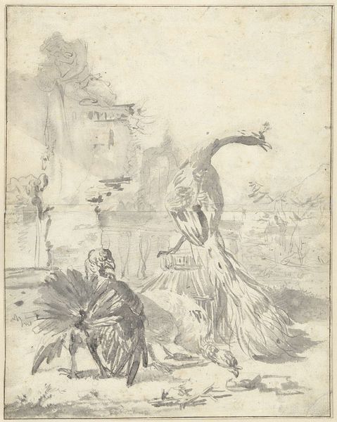Editor: This is "The Family of the Oriental Peasant, from the Scherzi," an etching by Giovanni Battista Tiepolo, created sometime between 1725 and 1780. I find the scene quite dreamlike; what strikes you most about this piece? Curator: Immediately, my eye is drawn to the owl perched above the family. The owl, traditionally a symbol of wisdom, but also associated with darkness and the nocturnal, lends a layer of mystery. It observes, much like we, the viewers, are invited to observe. Do you notice the ambiguous expressions on the faces of the figures? Editor: Yes, there's a sense of melancholy, or perhaps just weariness. They seem caught between worlds. Is that ox there too, observing them? Curator: Precisely! The ox shares a silent gaze. Note how Tiepolo uses animals here – not as mere decorations but as symbols intertwined with the human narrative. The owl as nocturnal wisdom, the ox, possibly related to ancient gods or more rural roots. Does this spark anything within you? Editor: I suppose it shows a blending of cultural ideas, an 'Oriental' peasant family seen through a European, almost theatrical, lens, with added classical imagery in the animals. Curator: Precisely! The "Oriental" label itself is revealing, pointing to European fascinations with the East, filtered and romanticized. How do these observations impact your initial sense of the work? Editor: It feels more complex now. Not just a quiet scene, but a statement about cultural perspectives, symbols and perhaps the idealised life too. Curator: Indeed! Tiepolo encourages us to look beyond the surface and contemplate the multiple layers of meaning embedded within this seemingly simple family portrait.