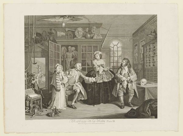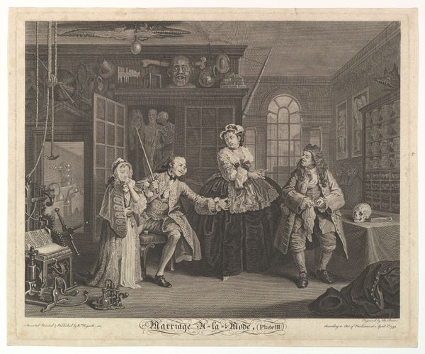 Bernard Baron created this print, Plate III from Marriage à la Mode, using engraving techniques. The print presents a scene dense with detail, rendered in a monochromatic palette that emphasizes form and texture. A palpable tension fills the room, underscored by a composition where figures cluster yet remain isolated within their own dramas. Notice the artist's use of linear perspective, drawing the eye towards the back, yet disrupted by the chaotic arrangement of objects and characters. The details of the setting—from the grotesque statuary atop the cabinet to the discarded clothing on the floor—contribute to the narrative of moral and social decay. These elements function as signs, hinting at underlying narratives of corruption. The artist invites us to decode the social commentary embedded within this domestic space, using formal elements to destabilize any straightforward reading. Consider how the stark contrast between light and shadow heightens the emotional intensity. The composition, rich with semiotic meaning, reflects broader philosophical concerns about morality, class, and the human condition.