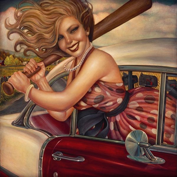 Curator: Danny Galieote's painting, "Back In The Saddle," presents us with quite the striking image. My initial thought is it plays heavily with concepts of danger and beauty, a slightly uneasy juxtaposition. Editor: Uneasy is right. The painting features a woman, styled as a cowgirl, reclining on what is clearly a bomb. The textures—the soft rendering of her skin against the hard, metallic sheen of the bomb—create a provocative tactile contrast. Curator: Exactly. It brings to mind the pin-up girls of the World War II era, images that served as both morale boosters and, undeniably, objects of desire. Here, though, Galieote places the figure directly atop a symbol of destruction. Editor: There’s definitely an uncomfortable merging of traditionally gendered power dynamics happening through this piece. The slick paint handling adds to that impression as it elevates this potentially troubling combination into something technically proficient, if also somewhat… disquieting. Curator: I see this piece working within an ongoing discussion in the arts related to militarization and visual culture. Is this a celebration, a critique, or something in between? Galieote leaves it open, forcing the viewer to confront those questions. Think about it too through the male gaze, and how these pin-up traditions of advertising continue to be negotiated within painting practices. Editor: And consider the craft involved –the painting of the glossy, lethal looking bomb. I think Galieote draws attention to the labor and artifice behind these images, inviting a deeper consideration of not just their visual appeal but the power dynamics inherent to their production and reception. Curator: It's a bold statement, especially given its roots in commercial and potentially erotic art. I find myself wondering about the artist's intention. Is it simply a provocative image or is there a deeper commentary on war, gender, and power embedded within it? Editor: For me, what is really revealed, is how something designed for destruction becomes entangled with images and representations surrounding glamour. “Back in the Saddle” brings this violent transaction vividly to the fore through both the material reality of paint, and in relation to social visual narratives. Curator: It is this tension, this friction between seemingly disparate elements, that makes "Back In The Saddle" such a compelling and unsettling piece. Editor: Indeed, and hopefully one that leads to constructive debate about how we make images, consume images, and attach them to objects designed for violence.