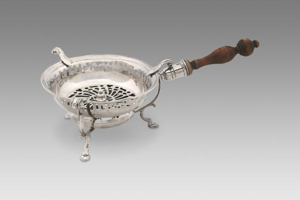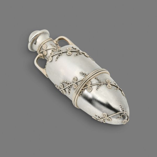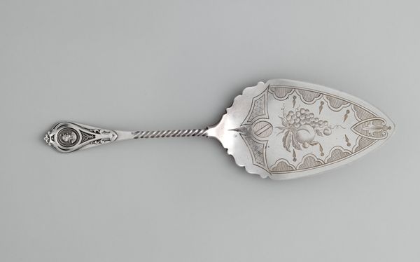 This silver fish slice was crafted by Schulz & Fischer. The piece presents a fascinating study in symmetry and ornate detail. The broad, flat blade is intricately engraved with geometric patterns and floral motifs, reflecting a play of light and shadow across its surface. The handle, slender and cylindrical, leads to a medallion featuring a classical profile, a subtle nod to historical and cultural narratives. The linear design of the handle contrasts with the curvilinear flourishes of the blade, creating a visual dialogue that is both elegant and functional. This contrast, combined with the shimmering quality of the silver, invites a reading of the object as more than a mere utensil. It suggests a commentary on social ritual, and a moment of artistic expression embedded within the everyday.