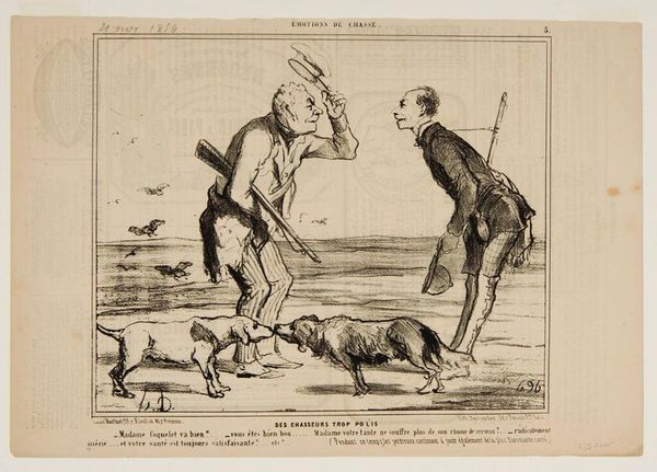 Curator: This is an intriguing lithograph by Honoré Daumier titled "Hey there, what are you doing there, M. Crunichon? ...I trust you aren't counting on catching something by sitting on the grass?". Editor: It has such a wonderfully sardonic feel. The contrast between the upright, almost aggressively stout figure and the seated one creates a palpable tension. Curator: Indeed. Daumier often used his art to comment on social dynamics, and here, the figures’ postures reflect their assumed roles within the hunting narrative. The title suggests a power dynamic as well, the standing figure questions the actions of the sitting one. Editor: Absolutely. There's a clear social critique at play. The act of hunting, typically associated with privilege, is satirized through these figures' almost absurd interactions. It seems as though Daumier is challenging ideas of leisure and class. Curator: The hunter, ironically, seems like he is the prey. There's also the figure of the dog, seemingly resigned to the scene. His posture indicates that his master has been sat for awhile. Editor: It adds a layer of poignancy. Ultimately, it's a reflection on the ironies of leisure and the human condition. Curator: I find that, with Daumier, satire cuts to deep truths. Editor: Exactly. It's a thought-provoking piece.