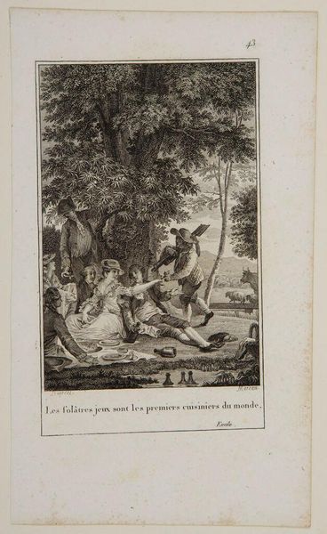 Curator: This is an etching by Charles François Adrien Macret, its title rather wonderfully is, “I started to laugh, the others laughed, then the child started laughing as well.” Editor: It feels like a captured moment, a shared joy rendered in delicate lines. A real snapshot of pure, unfiltered happiness. Curator: Macret, who lived in the latter half of the 18th century, was known for his illustrations. This one certainly echoes Enlightenment ideals, doesn’t it? The emphasis on emotion, on human connection… Editor: Absolutely. And the setting—a rather idealized pastoral scene. It feels staged, almost theatrical, but there’s a genuine warmth radiating from the figures. It’s a really sweet vignette. Curator: It's intriguing how Macret portrays this shared laughter, making it almost a social commentary through an intimate family moment. The social function of art comes to mind here. Editor: Art is a mirror and also a magnifying glass... So well observed and full of playful charm. Curator: Indeed, it’s like a reminder that laughter is a universal language, isn't it? Editor: Yes, precisely; a sentiment as relevant today as it was centuries ago.