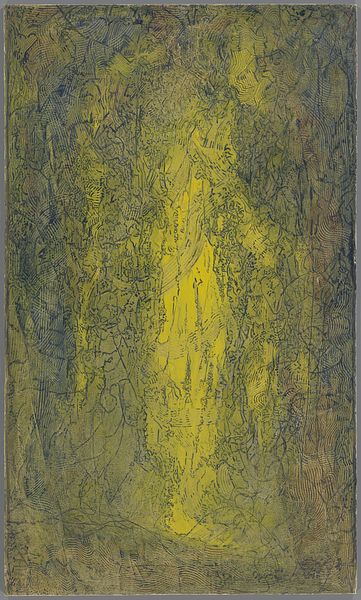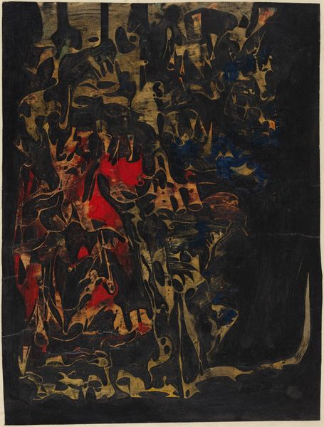 Editor: We’re looking at "Composition II, Dark" by Simon Hantai, rendered in ink and possibly other media on paper. It's…well, it's *dark*, quite chaotic, actually. Almost suffocating in its density. How do you interpret this work, considering the social or cultural climate it was created in? Curator: A good question. Hantai, though associated with Abstract Expressionism, actively distanced himself from its heroic individualism, something promoted significantly by American institutions during the Cold War. How does this knowledge shift your perception of the “chaos”? Editor: It makes me think that the darkness might not be despair, but rather a commentary on something larger, a reaction against a dominant narrative. But against what specifically? Curator: Exactly! It's useful to understand that Hantai, as a European artist working in the postwar period, saw Abstract Expressionism heavily promoted as an emblem of American freedom and individualism, in contrast to Soviet collectivism. Works like these pushed back. Do you think you see some subversive symbolism? Editor: Perhaps… these darker abstract pieces don't so much embrace complete freedom of expression as critique the pressure to conform to specific, nationally-branded styles of freedom. Is it fair to see this as almost a political act of refusal, rendered in abstraction? Curator: Precisely. Abstraction, in this context, isn’t just about form; it's about questioning the socio-political frameworks dictating artistic value. It certainly pushes us to question the accepted art narratives from the time. Editor: That's fascinating. I was so focused on the darkness as an aesthetic choice, but seeing it as a response to cultural pressure really opens up the conversation. Thanks! Curator: Indeed. It serves as a potent reminder that art doesn't exist in a vacuum; it engages in ongoing dialogues with power, history, and its contemporary moment.