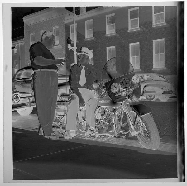 Editor: This photograph by Jack Gould, titled "Untitled (newsboy with bike, scattered papers on ground)," depicts a chaotic street scene. The negative really heightens the drama. What strikes you about it? Curator: The scattered papers feel like a visual poem, a flurry of lost voices. The newsboy, mid-gesture, is frozen in time, and I wonder what headline he's shouting, what story he's desperate to share. Editor: It's like a moment of suspended animation. Curator: Exactly! And the Plaza theater in the background, advertising "Always Two Big Feature Attractions", is a reminder of the fleeting nature of news, swallowed up by entertainment. What do you make of that? Editor: It makes you think about what lasts and what doesn't. Curator: Precisely. Makes me want to buy a newspaper, or at least visit an old movie palace.