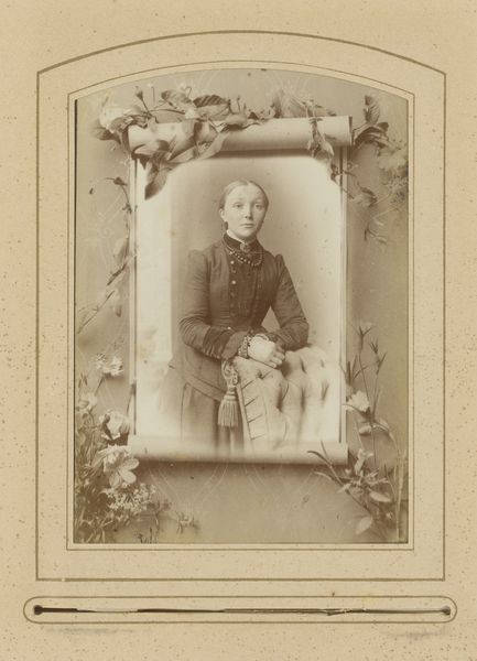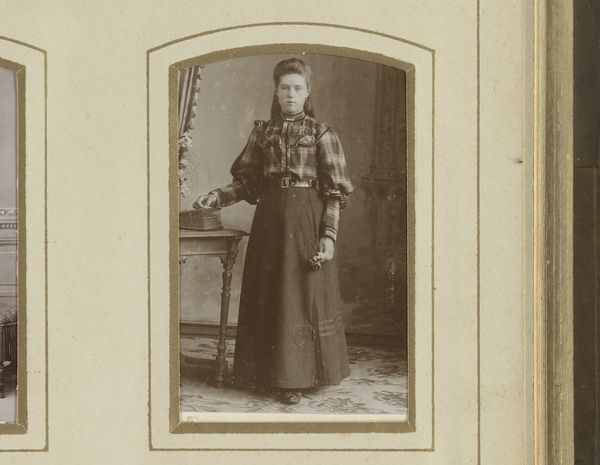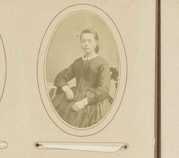 Curator: Let’s discuss this intriguing piece, "Portret van een meisje, staand bij een stoel," which translates to “Portrait of a Girl, Standing by a Chair.” It’s an albumen silver print that probably dates sometime between 1860 and 1900. What strikes you immediately about it? Editor: The stillness. It's so quiet. This image feels frozen, not just in time, but in emotion. Her posture, her gaze, even the meticulously arranged props – it's all very controlled and reserved. I can't help but wonder what's going on behind those eyes. Curator: It’s precisely that sense of constructed formality that fascinates me. Portrait photography during this era served a specific social function. Think about the rise of the middle class and their desire to emulate aristocratic traditions. Photography democratized portraiture, making it accessible to more people as a tool for constructing identity and status. Editor: Absolutely. But looking at it through a contemporary lens, I can't ignore the layers of power dynamics at play. Who dictated this pose? What agency did this young girl truly have in representing herself? And why does she look so uncomfortable? Is it the clothing or the idea of having her portrait taken? The gaze says a lot without actually speaking. It raises a conversation around performance, and performativity, during this period. Curator: It’s a good reminder to unpack these historical representations. Her dress, the chair, the backdrop, even the slight blurring indicating the long exposure time-- they’re all intentional visual cues contributing to a carefully crafted image that served specific purposes within the social milieu of the time. Editor: Agreed, it really makes you think about the intersectional aspect here - the young woman, gender and identity as well as socioeconomics that shaped photographic portraits as social markers and gendered presentation. It’s more than just a pretty picture, isn’t it? Curator: Exactly. It is an artefact, frozen in time that embodies social ambitions and constructs a specific version of reality and tells more than the obvious, Editor: Thanks, seeing art as active participant with context gives these amazing photograph a deeper, often uncomfortable conversation.