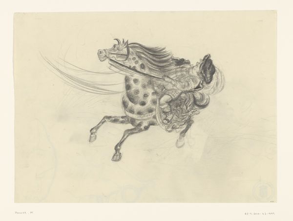 Aat Verhoog made this etching of a jumping horse and rider, called 'Springende ruiter', with incredible economy of line, almost like a memory being sketched. It's so spare, you know? The paper is almost empty, yet the tension is palpable, all located in the careful pressure of the line. The horse seems to float across the surface, its form emerging from the white ground, and the rider, hunched tight, so focused, yet drawn with a lightness, a kind of swift confidence. Look closely, and you can see the artist's hand, the way the lines vary in thickness and direction, giving a sense of movement. The texture of the paper adds to that feeling, creating a subtle vibration. It reminds me of drawings by Degas, who was also obsessed with horses, but without the colour, the gesture is even more direct. It’s that directness, the sheer simplicity, that makes it so affecting. It feels so alive, that horse and rider really are flying, for a moment.