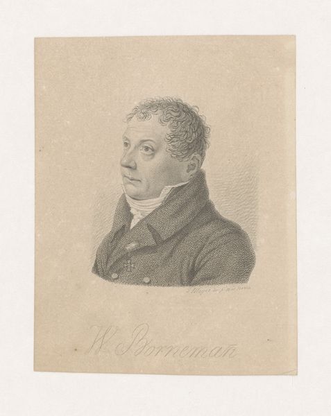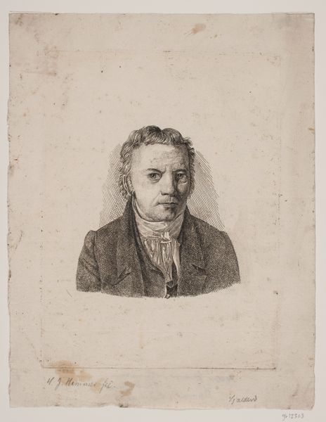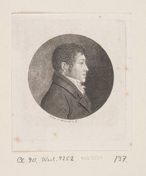 Editor: Here we have a portrait of Adam von Bartsch, an etching made by Heinrich Gustav Adolf Leybold, sometime between 1804 and 1842. It's quite austere, a man framed in an oval. The linework is so delicate. What captures your attention in this piece? Curator: Ah, yes! It’s as though time has settled on this print like dust, hasn't it? Look closely; it's not just a portrait, it's a whisper from a world obsessed with order, reason... neoclassicism at its most buttoned-up. I sense Leybold's own ambivalence—dutifully rendering Bartsch, yet subtly, almost invisibly, yearning to break free from such rigid forms. Editor: I see what you mean. It's almost…clinical? Did the subject's status affect how artists approached these portraits? Curator: Absolutely! Bartsch was a powerful figure in his own right, head of the print collection at the Albertina. I wonder if Leybold felt pressure to portray him in a certain, authoritative light, suppressing a potentially more vibrant interpretation? Notice how every line, every shadow is carefully considered. It almost lacks breath. What would happen if we scribbled a bit here, broke the oval, wouldn't it be fun? Editor: Perhaps. The precision is interesting, though. Is it purely Neoclassical, or is there something else at play here? Curator: That’s the beautiful paradox, isn't it? This precision hints at a deeper longing. What did it mean to portray a person, especially one of influence, in such a calculated era? Did the subject consent to this picture of himself? We may not have the answers now, but it's fascinating to reflect. Editor: So, this isn't just a likeness, but also a time capsule, a glimpse into the dynamics between artist, subject, and the artistic conventions of the time. Thank you for shedding a new light on it. Curator: Absolutely! Now I cannot unsee this; and I am already curious to ponder on a different piece of work, this way of thinking. It’s not just about seeing but about seeing through the surface.