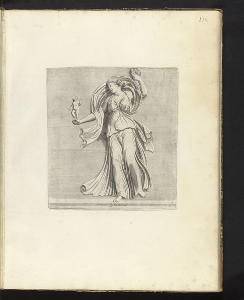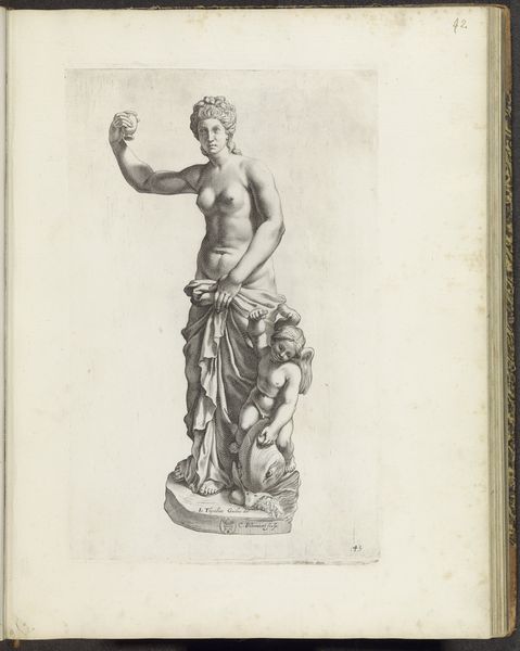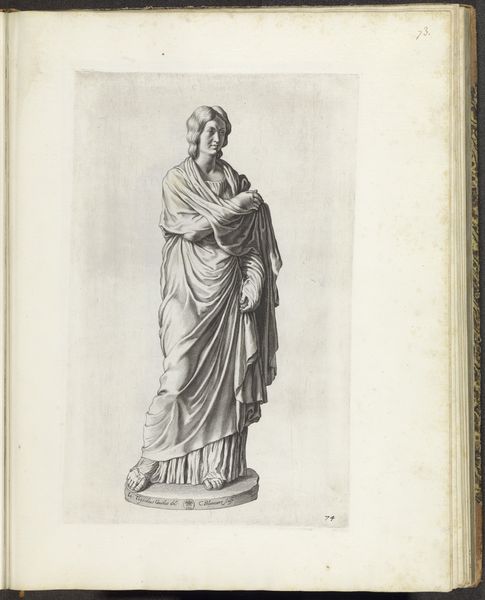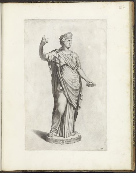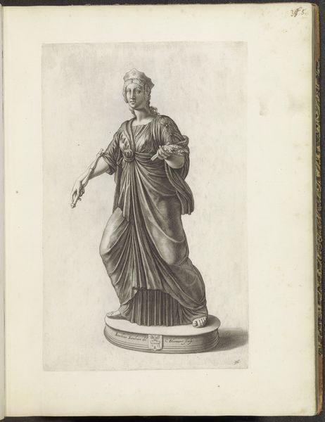 This print of a sculpture of Flora was made by Cornelis Bloemaert, likely in the mid-17th century. The medium is engraving, a process that demands careful, controlled labor. Lines are incised into a metal plate, then filled with ink and printed. Consider how this technique influences the appearance. The crisp, precise lines mimic the cold, hard feel of carved stone. Bloemaert’s skill in using cross-hatching creates volume and shadow, giving the figure a weighty, three-dimensional presence. Engraving, unlike the free gestures of drawing or painting, mirrors the sculptor's process of slowly removing material to reveal the form within. Both require patience, precision, and a deep understanding of form. This print thus not only depicts sculpture but embodies the values of skilled handwork. In an age increasingly dominated by mass production, let’s remember that such images played a crucial role. They disseminated knowledge of classical forms, spreading aesthetic ideals to wider audiences. They celebrated not just the beauty of Flora, but also the artistry of human hands.