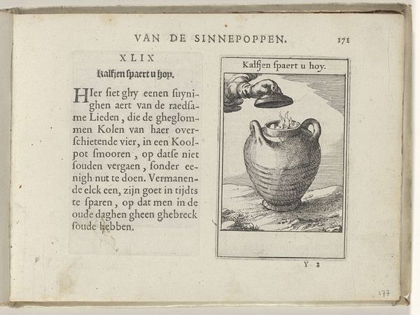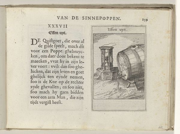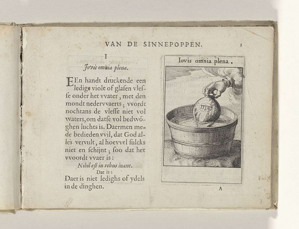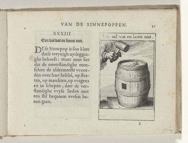 Curator: Looking at this fascinating piece, "XLIII Soo langh de Roe wanckt" from 1614, I'm immediately struck by the stark simplicity of the black ink on paper. Editor: Yes, it feels melancholic. The spinning top teetering, clearly about to fall, and the rather ominous looking whip… it speaks of transience and maybe even futility. Curator: Exactly. The engraving by Roemer Visscher is part of a larger emblem book. Emblem books like this served a very specific cultural role. They combined images with mottoes and explanatory texts to convey moral lessons. We need to consider how this book was disseminated, read, and understood within its social context. It wasn’t simply "art," it was a didactic tool. Editor: The materiality interests me—the creation of these prints. Think about the process. The engraver, meticulously carving into the copper plate, mass producing this image for distribution... It challenges this division between fine art and what we consider "craft" today. Curator: Agreed, the act of producing and consuming these prints was intertwined with the growing literacy and print culture of the Dutch Golden Age. It shaped public opinion and fostered a sense of shared identity, despite class differences. This was how a collective morality could be formed, in essence. Editor: And the image itself is a commodity. Ink, paper, labor—all contributing to its message. How readily would these have been sold? Were these items exclusively for the affluent members of Dutch society or where they made and sold to all in Dutch society. I do think we must note this artwork’s social agency. Curator: It makes you consider, in terms of current tastes: Is it considered low brow or high brow art, is it worth millions or worthless paper with simple design? That notion has evolved dramatically, when viewing the world in a contemporary context. Editor: A powerful and very intriguing observation to complete the dialogue.