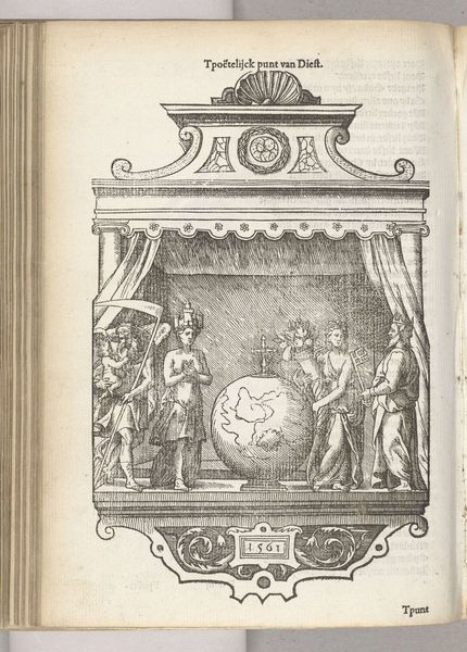 This engraving, titled "Vertoning van De Lisbloem (Mechelen)," dates back to 1561 and is by an unknown artist. The composition is striking for its balanced yet dynamic arrangement. The scene is framed by architectural elements with figures arranged in a shallow, stage-like space. Note the symmetrical placement of the columns and the arch above, contrasted by the asymmetry within the central scene. On the left, we see an angel figure holding scales, balanced by a seated, bearded man on the right with the kneeling figure beneath the female figure. Each element, from the scales to the floral staff held by the female figure, acts as a sign. What cultural codes can we discern? The scales represent justice, while the flowers could symbolize prosperity or civic pride. The kneeling figure and the dog seem to signal loyalty or submission. The engraving invites us to question the relationship between justice, civic authority, and moral submission. Its enduring power lies in how it prompts ongoing interpretation.