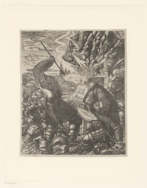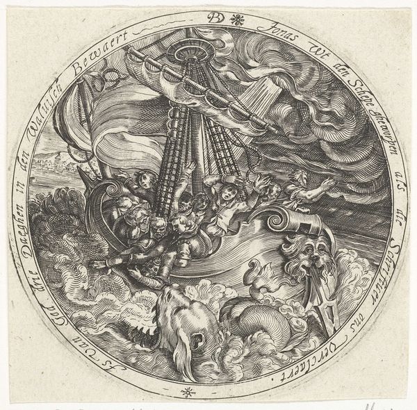 Curator: Just look at this! A whirlpool of despair captured in ink. Editor: Yes, the visual chaos is immediately striking. What are we seeing? Curator: This is "Envy, from the 'Seven Deadly Sins'," an engraving made between 1545 and 1560. It's currently held at the Metropolitan Museum of Art. The artist is Léon Davent. Editor: The old engraving style amplifies the grotesque imagery, wouldn't you agree? All these writhing bodies... it feels incredibly violent. Curator: The artist clearly intends to disgust. Look at how Envy, personified as a monstrous hag, is being devoured by serpents and surrounded by symbols of greed and bitterness. It's a potent warning. There is a tail also in this monster body. Editor: And the landscape itself seems to mirror this inner torment. Twisted trees, dark clouds, and those ominous birds circling overhead – even a devil on the ground is trying to get something out of the naked person that seems on the ground. Curator: Indeed, the visual language reflects the internal state. The composition guides the eye from the serene figures at the top, presumably representing virtue, down into the spiraling depths of sin. Editor: The religious implications are unmistakable; and, even though the moral lessons is important, what social and cultural concerns in early modern Europe fed into this visual manifestation of envy? Was it simply religious instruction? Curator: Certainly, the church played a vital role, but anxieties surrounding social mobility, wealth disparity, and courtly intrigue likely fueled its wider appeal. Envy as a societal ill. And to contrast it, we can see the line of happy, harmonic people in the clouds, above it all. Editor: Right. What makes it particularly resonant, for me at least, is how it reflects a persistent human struggle. Envy never really goes out of style, does it? Curator: Sadly not. A timeless reminder, even rendered in this dated aesthetic, of our darker inclinations. Editor: A powerful and disturbing piece—a visual history of one of humankind's more unfortunate traits.