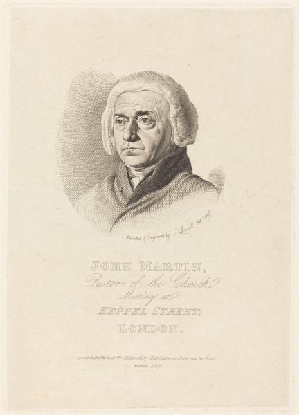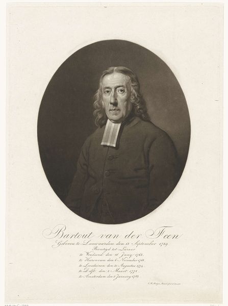 Editor: This is a print titled "Portret van O. C. Wolterbeek," created sometime between 1828 and 1843 by Jan Lodewijk Jonxis. It looks like an engraving, a medium I don't often see portraits rendered in. It definitely has a formal and perhaps even stern quality. How do you interpret this work, especially considering its historical context? Curator: The "stern" quality, as you say, might reflect the sitter’s social positioning. The Reverend Wolterbeek was likely a man of significant influence within his community. The portrait, and its distribution through print, serves not just as a likeness, but as a statement of power and authority. Who had access to portraiture like this, and what did that signify? What visual cues suggest this social hierarchy to you? Editor: I suppose the wig and formal attire speak to status, maybe education as well? Were printed portraits common for disseminating information about influential figures? Curator: Exactly. This print circulated within a specific social sphere, reinforcing existing power structures. The meticulous detail achieved through engraving conveys a sense of realism, which in turn legitimizes Wolterbeek's position. How does this contrast with more contemporary forms of portraiture and representation? Think about who gets represented now, and by whom. Editor: Today, photography and digital art offer broader access to portraiture, often challenging traditional power dynamics by focusing on marginalized communities. Here, Wolterbeek's gaze seems to assert dominance, while modern portraiture often seeks to empower the subject. Curator: Precisely. And what does that say about societal shifts in how we view leadership and representation? Consider also the role of institutions like the Rijksmuseum in displaying such images – are they reinforcing or challenging historical narratives? Editor: I hadn't considered the museum's role that way, but it is really something to think about. Thanks, that perspective really helps me contextualize this piece. Curator: Absolutely! These historical images have reverberating effects on modern cultural ideas about leadership and recognition.