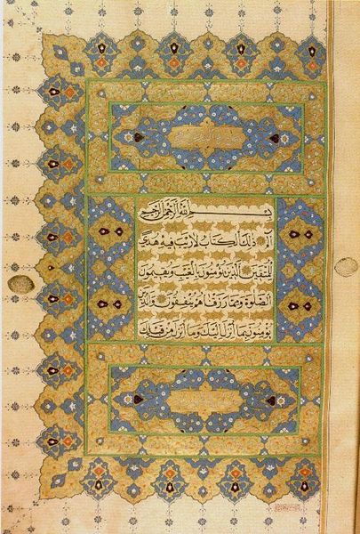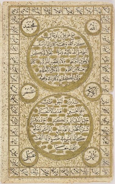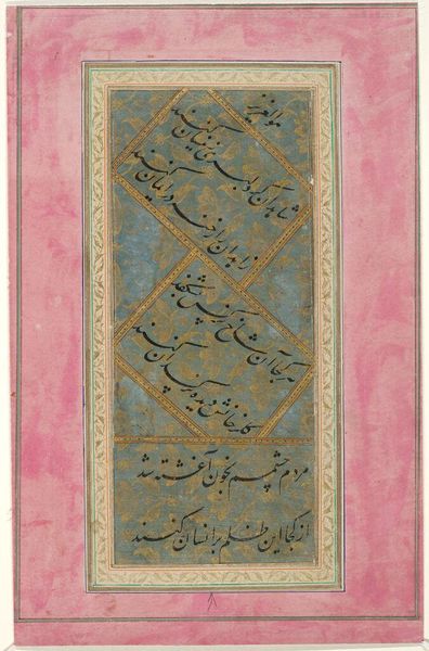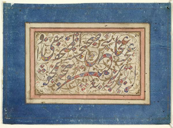 Curator: The flowing script just makes me feel peaceful. It is quite lovely to behold. Editor: This is a Chancery Document, a folio from an album. The calligraphy is by Ikhtiyar al-Munshi, also known as Kamal al Din. It’s currently held at the Harvard Art Museums. Curator: A chancery document! It looks more like poetry than paperwork. The framing border adds such a delightful ornamentation. Editor: Indeed, the materials used—ink, opaque watercolor, and gold on paper—speak to the value placed on official communication. Imagine the labor involved in its creation. Curator: Thinking about the hands that made it… the hopes or worries behind those words. It’s almost overwhelming! Editor: Absolutely, and its function as a document reminds us that even "art" is embedded in practical social relations. Curator: It truly blurs the lines between art and craft, doesn’t it? I love when art can do that. Editor: A necessary dissolution of boundaries, I think.