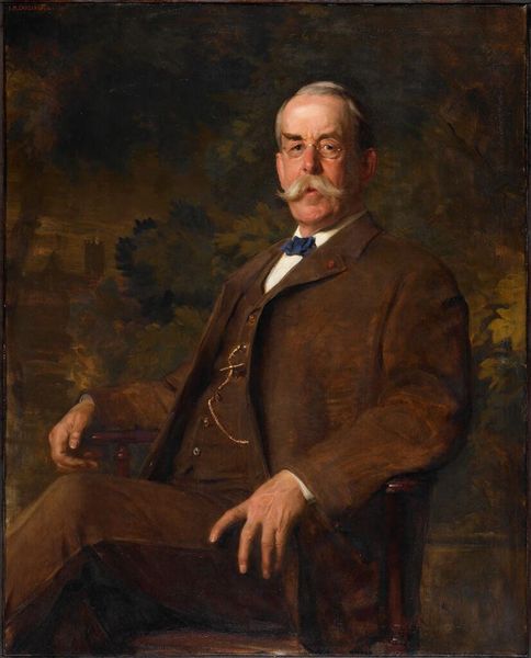 Curator: Here we have William Valentine Schevill’s oil on canvas, "Portrait of Prince Heinrich Hohenzollern," housed at the Harvard Art Museums. Editor: I’m immediately struck by the somber palette and the way the brushstrokes give the whole composition a sense of impermanence, of being caught in a moment. Curator: Indeed. It's interesting to note how Schevill, an American artist, engaged with European aristocracy. The portrait provides insight into the visual strategies employed to convey power and status. Note the subtle crown near the base. Editor: The artist uses a limited range of tones, focusing more on texture and layering to create depth, wouldn't you agree? The way the light catches the prince's face, yet leaves his coat almost swallowed by the shadows, is quite striking. Curator: The portrait reveals a moment in transatlantic cultural exchange, reflecting both American artistic innovation and Europe's enduring fascination with its own nobility. Editor: Absolutely. The painting's real power lies in how it reveals the sitter’s humanity through these formal qualities, giving it timeless appeal.