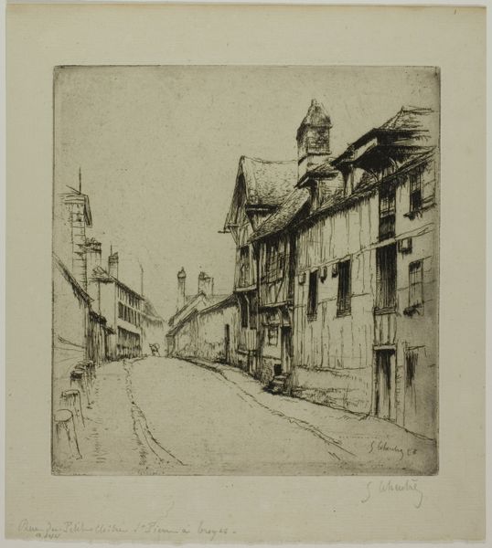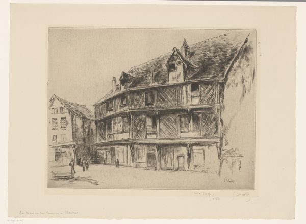 Gustave Leheutre created this etching titled 'Gezicht op een plein in Paimpol' sometime between 1871 and 1932. Leheutre’s print captures the quiet essence of a public square, likely somewhere in France. Here, we witness the rapid urbanization and modernization transforming French society. The buildings, with their quaint architectural details, stand as silent witnesses to the changing times. France during Leheutre's lifetime was a nation grappling with political upheaval and social reform. From the Franco-Prussian War to the rise of the Third Republic, France was at a crossroads, torn between tradition and progress. Artists like Leheutre often found themselves reflecting these tensions in their work. His choice to depict everyday scenes in a realistic yet romanticized manner speaks to a desire to preserve the beauty of the old world amidst the chaos of the new. To truly understand a work like this, we can consult historical records, photographs, and literature of the period. By doing so, we gain insight into the social and institutional contexts that shaped its creation.