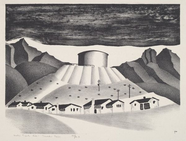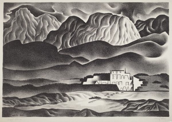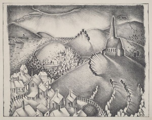 Curator: Here we have Richard Day’s "Mexican Landscape No. 2," a print created in 1933 using graphite. Editor: The mood strikes me immediately as somewhat austere. There’s a dreamlike quality too, almost surreal, in how the light falls and the composition simplifies forms. Curator: Notice the stark geometry that defines the architecture and the rolling hills. Day employs precise lines and subtle gradations of tone to create depth and volume. Semiotically speaking, there's an interesting tension between the organic curves of the landscape and the rigid, almost Cubist, rendering of the buildings. Editor: Precisely! That tension seems quite intentional. The stark white buildings, prominently featured atop the hills, hold a place of honor. Perhaps they signify not only physical elevation, but also a spiritual or cultural prominence in Mexican life and the colonial legacy. They radiate an aura of imposing historical authority. Curator: Yes, consider the contrast. The artist’s implementation of light and shadow heightens that drama. The foreground village appears grounded and practical in contrast with the more ethereal treatment of the hilltop construction. The artist masterfully organizes space to frame the structure. Editor: Visually, the light draws you upwards, compelling the eye to consider the significance of that imposing form above. Given its era, it probably invites dialogue about national identity. Mexicanidad as idealized, perhaps. The buildings represent both a past to grapple with, and present to reclaim. Curator: An astute observation. Further note how the subtle variations in the graphite render a rich tapestry of textures, from the smoothness of the buildings to the more textured undulations of the land. These tactile elements enrich the work, imbuing it with material complexity beyond the representational. Editor: It all coalesces into an introspective gaze at both cultural and spatial identity, and the dream-like quality heightens its reflective atmosphere. It begs you to contemplate its place and historical moment. Curator: A brilliant insight, revealing how Day’s artistic articulation resonates even today, prompting continued re-evaluation of our inherited pasts. Editor: Indeed, the landscape prompts us to look again, recognizing not just the form, but the history etched within.